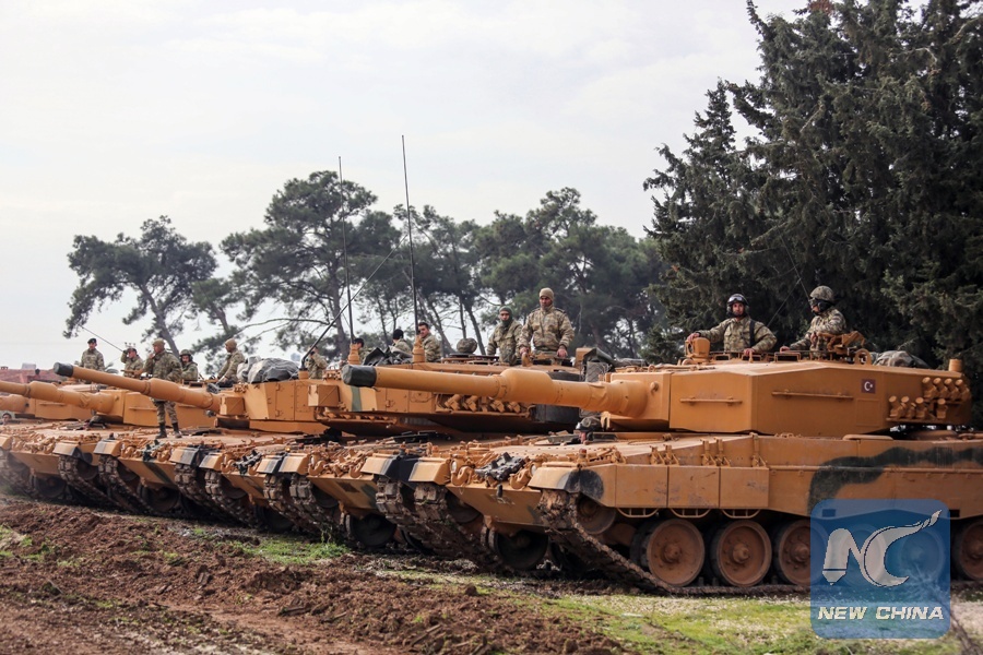 Turkish soldiers prepare their armored vehicles near the Syrian-Turkish border at Reyhanli district in Hatay, Turkey, on Jan. 21, 2018. (Xinhua)