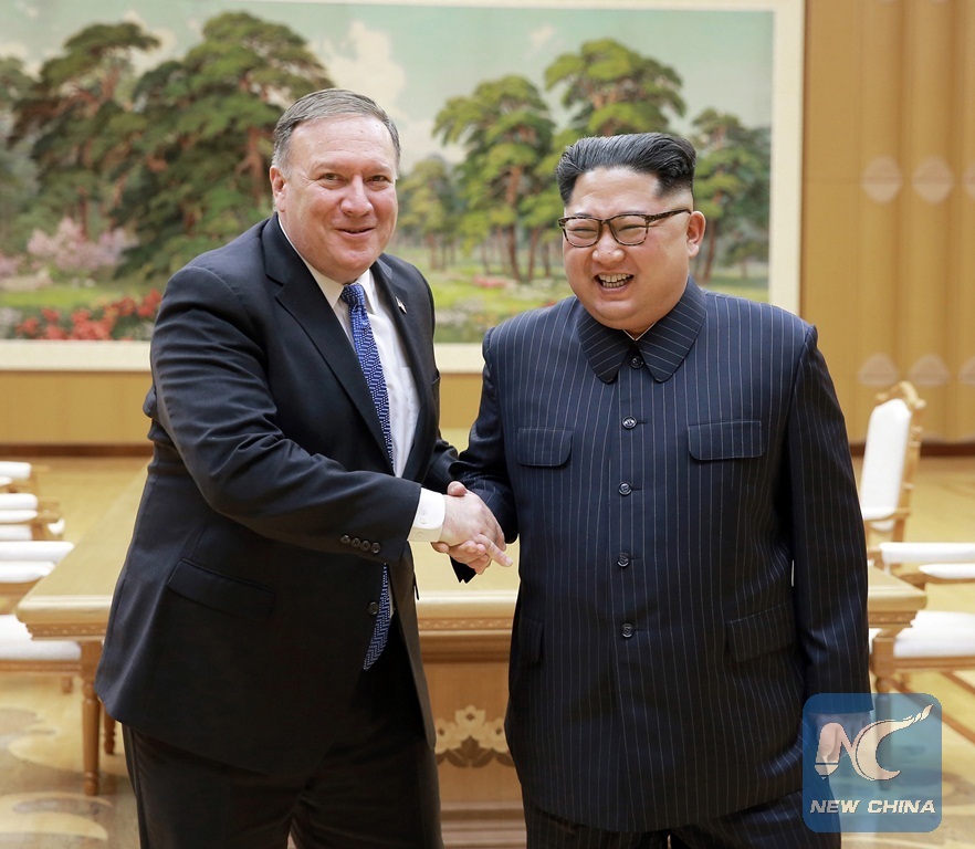 Photo provided by the Korean Central News Agency (KCNA) on May 10, 2018 shows Kim Jong Un (R), top leader of the Democratic People's Republic of Korea (DPRK), shaking hands with visiting U.S. Secretary of State Mike Pompeo on May 9, 2018. (Xinhua/KCNA)