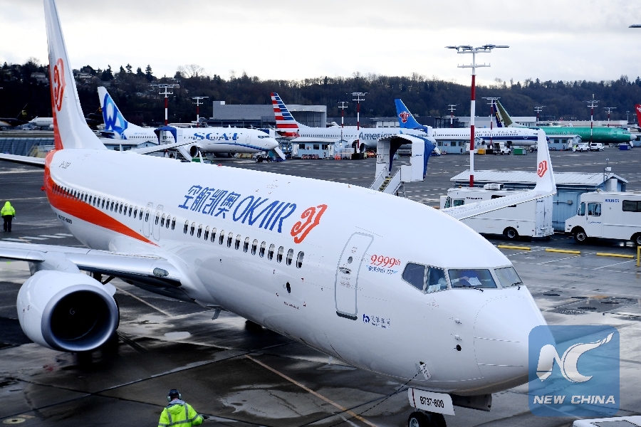 File Photo: The 9999th Boeing 737-800 aircraft prepares to take off from the company's Seattle airfield in the state of Washington, the United States, March 24, 2018. China's air carrier Okay Airways witnessed the 9999th Boeing 737-800 aircraft delivered by the Boeing Company embarked on a home-bound journey back to China from the United States. (Xinhua/Wu Xiaoling)