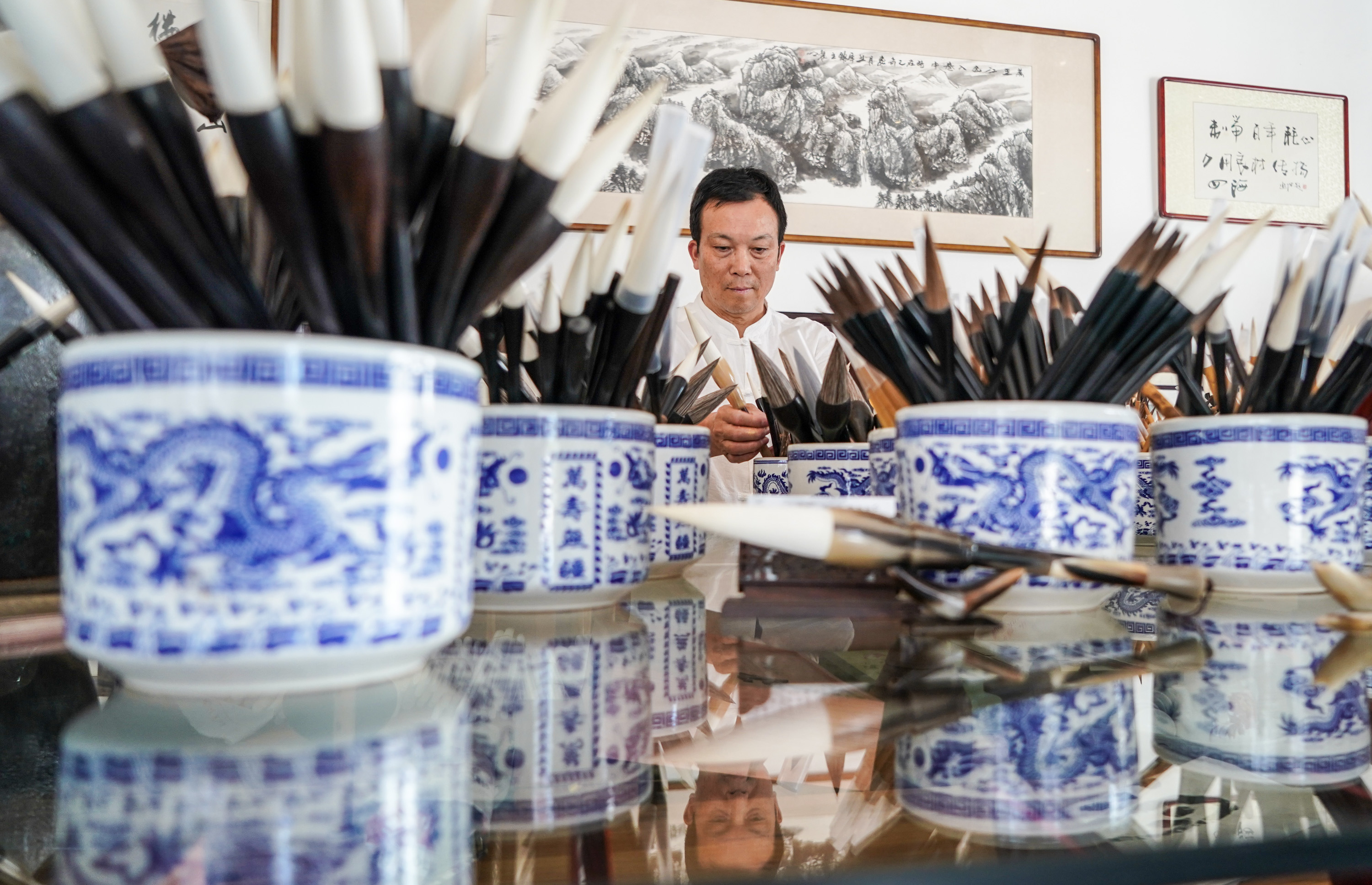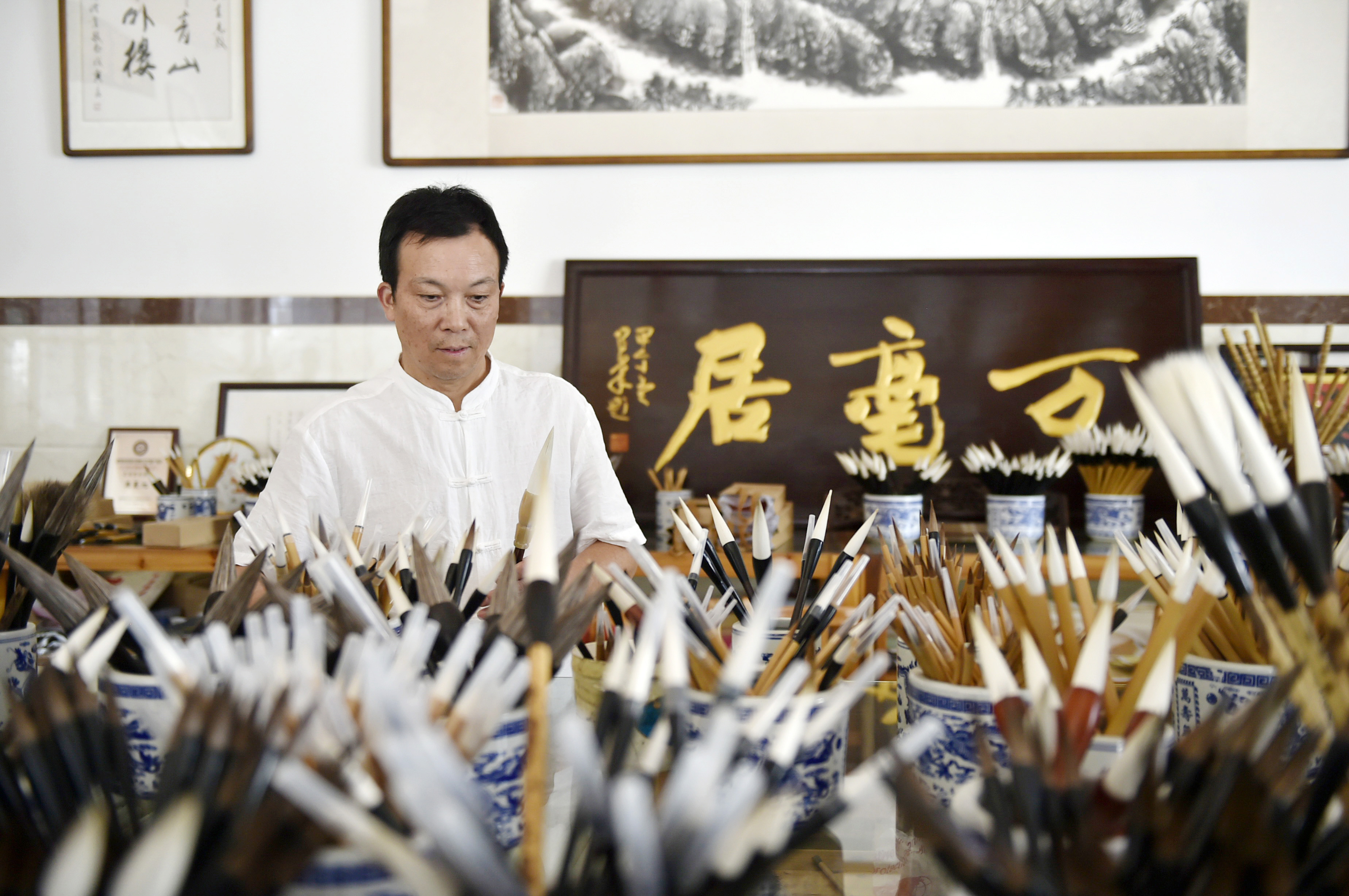 Brush pen craftsman Zhou Pengcheng arranges brush pens at his workshop in Wengang Township of Jinxian County, east China's Jiangxi Province, Aug. 8, 2019. (Xinhua/Li Bo)