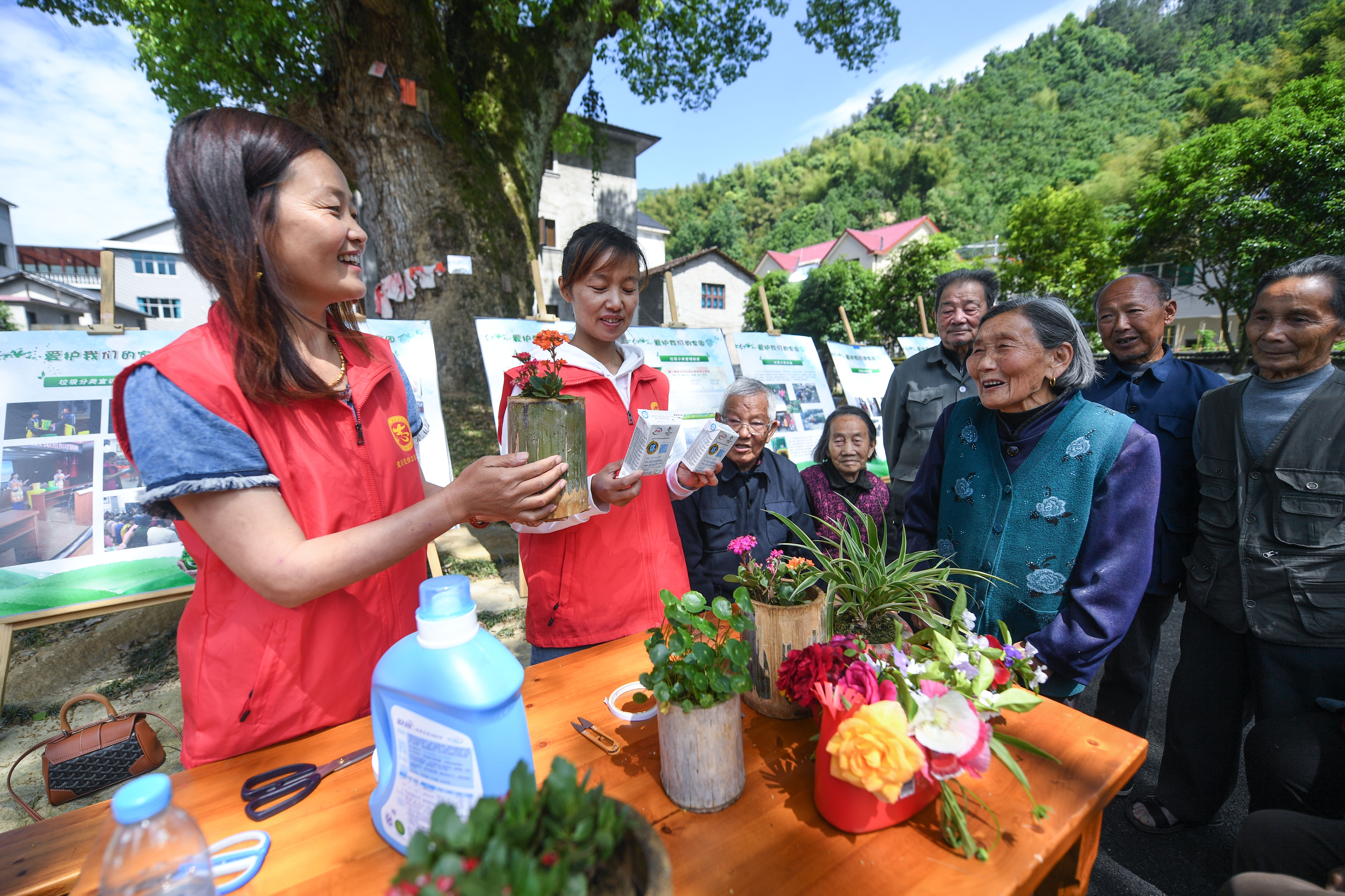 Volunteers introduce garbage sorting and recycling tips to villagers in Yingfeng village of Lin'an District in Hangzhou, east China's Zhejiang Province, May. 7, 2019. (Xinhua/Xu Yu)