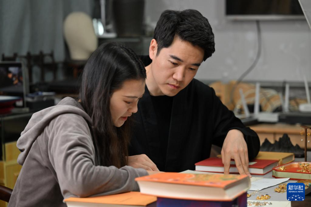 马赛(左)在工作室内与女朋友闵方苹在汉服爱好者佩戴头饰时商讨制作细节(3月7日摄)。
