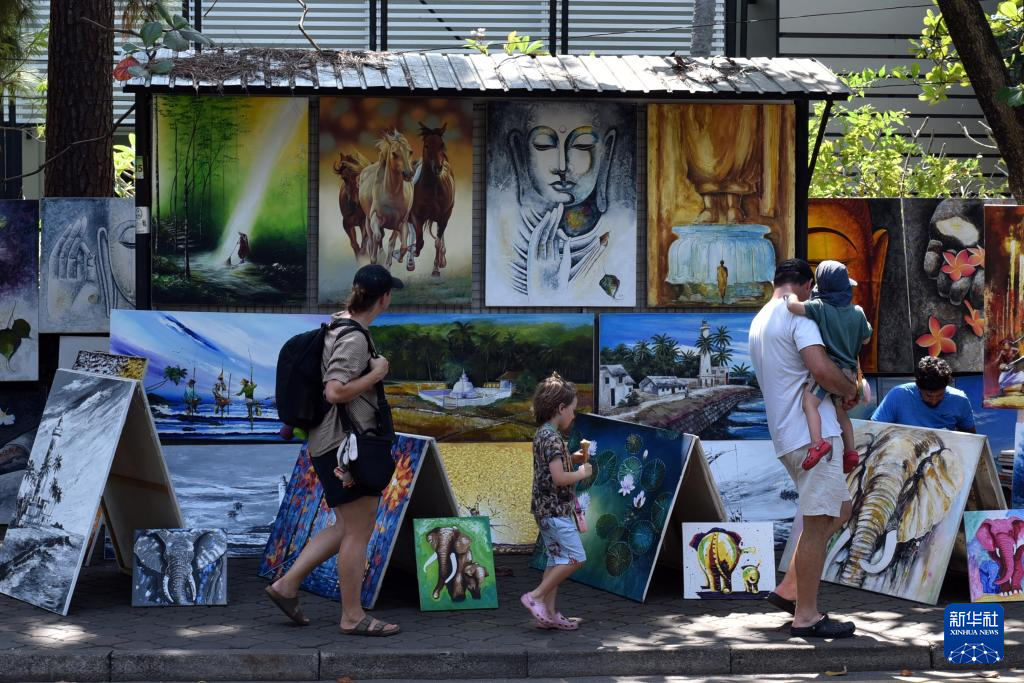 1月8日,人们在斯里兰卡科伦坡市中心“绿径”街头艺术画廊前欣赏画作。
