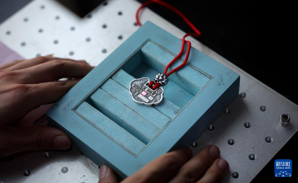3月13日,孙朋在顾客订做的长命锁上用激光雕刻信息。