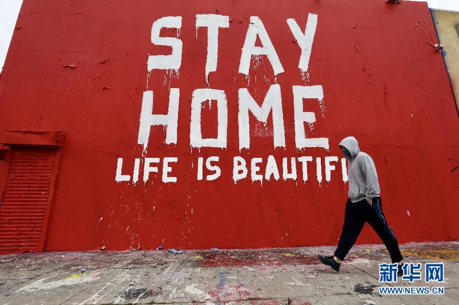 4月9日,一名男子經(jīng)過(guò)美國(guó)洛杉磯市區(qū)內(nèi)的防疫主題的壁畫。 為減緩新冠病毒的傳播,洛杉磯市長(zhǎng)7日下令,民眾在公共營(yíng)業(yè)場(chǎng)所要戴口罩或用織物遮擋住臉,這一行政令于2020年4月10日生效。 新華社發(fā)