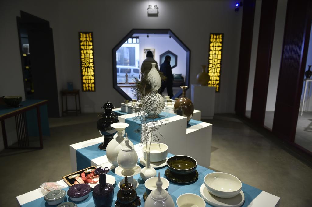 12月25日,观众在河北省曲阳县一家定瓷生产企业的展厅参观。
