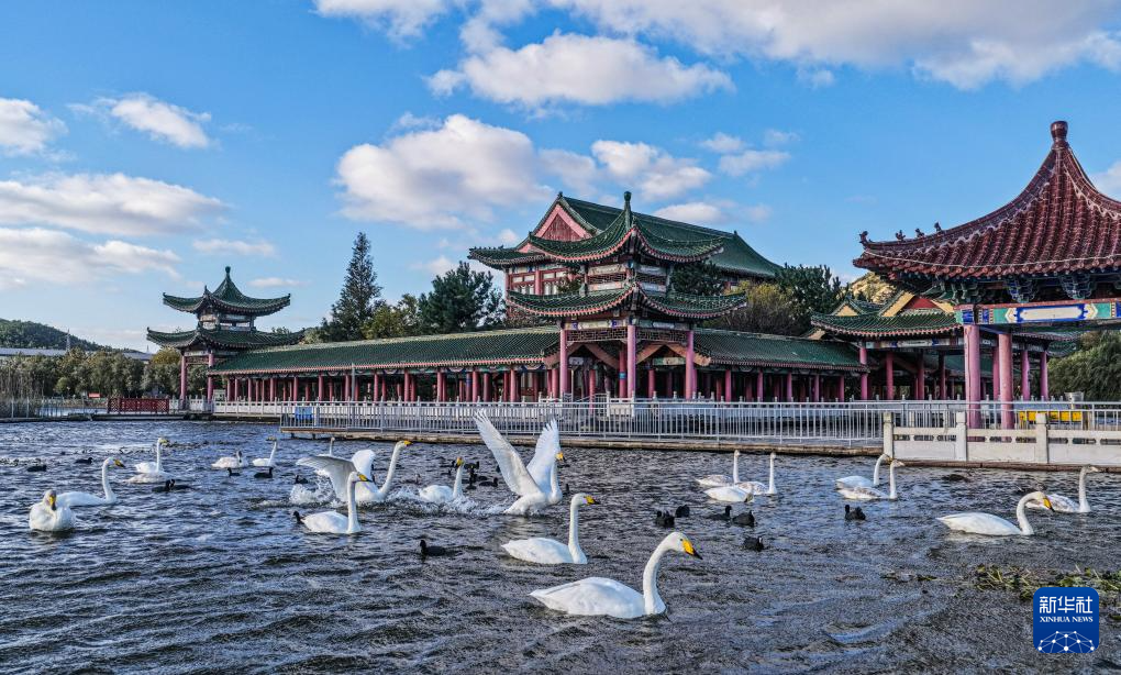 11月2日,在山东省荣成市成山镇西霞口隆霞湖公园,大天鹅在栖息、觅食(无人机照片)。