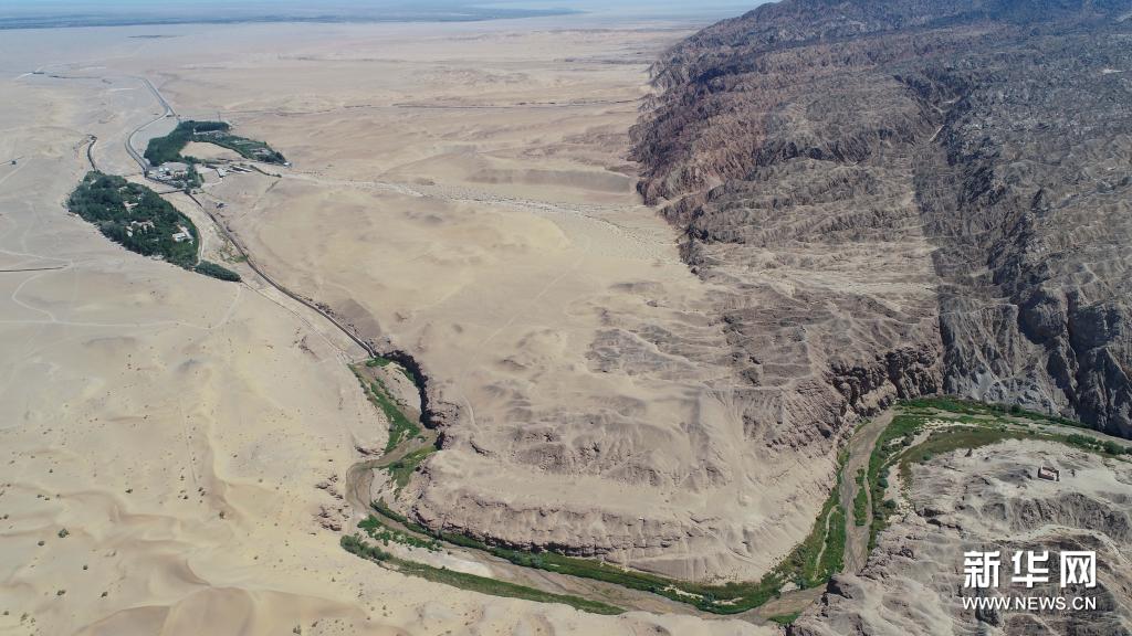 鳥瞰大泉河及其流經(jīng)的敦煌莫高窟(7月6日攝,無人機(jī)照片)。新華社記者 劉詩平 攝