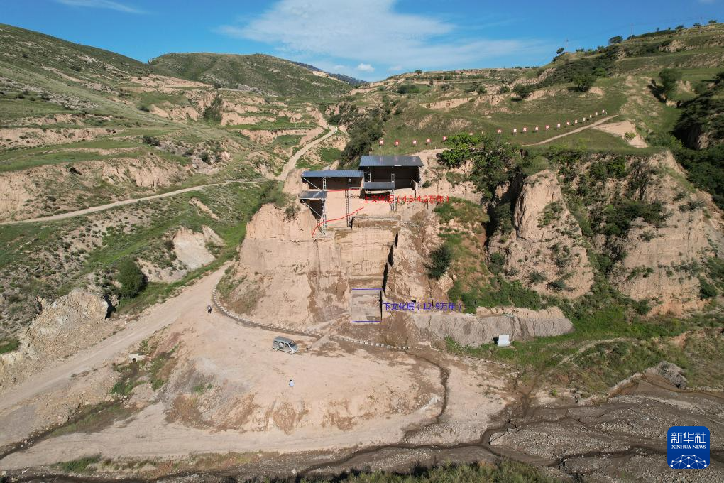 河北阳原县新庙庄旧石器时代遗址2号地点发掘区远景与文化层分布(资料照片)。