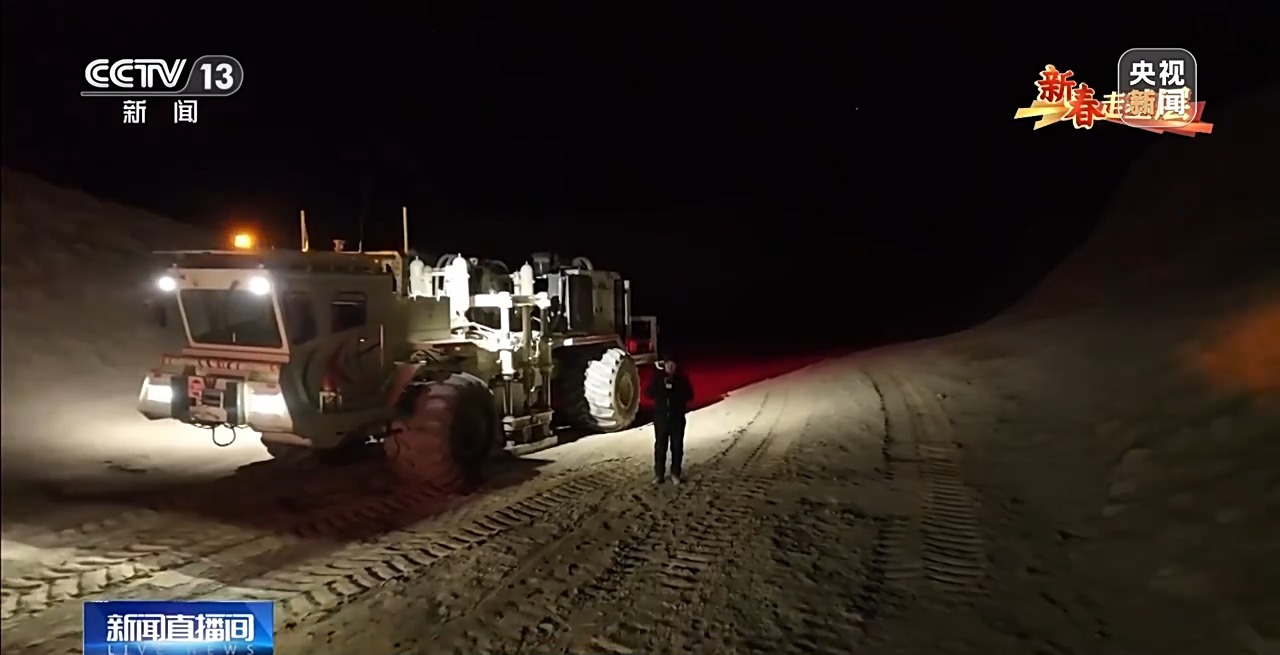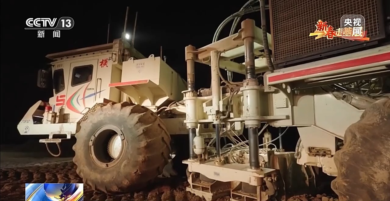 总台记者 王小龙:现在是凌晨两点左右,我手中的温度计显示,这里的最低气温已经低至零下26摄氏度,我身旁这个重达30多吨的大家伙就是整个物探作业中最核心的设备——震源车,队员们马上就要通过操作它来向地下深处释放地震波。