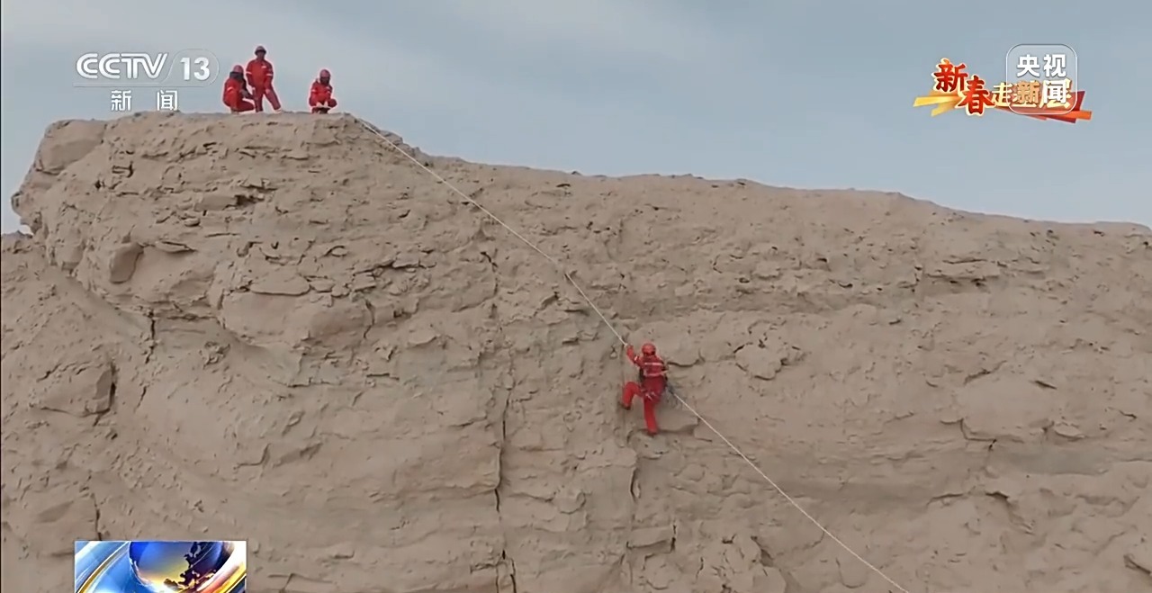 刘辉:这个坡得十多米,这还是雅丹地貌里最普通的,还有比这个高的。看着脚底下,表层一层虚浮土,比较滑,一定要踩稳了,然后抓紧绳子往上拽。