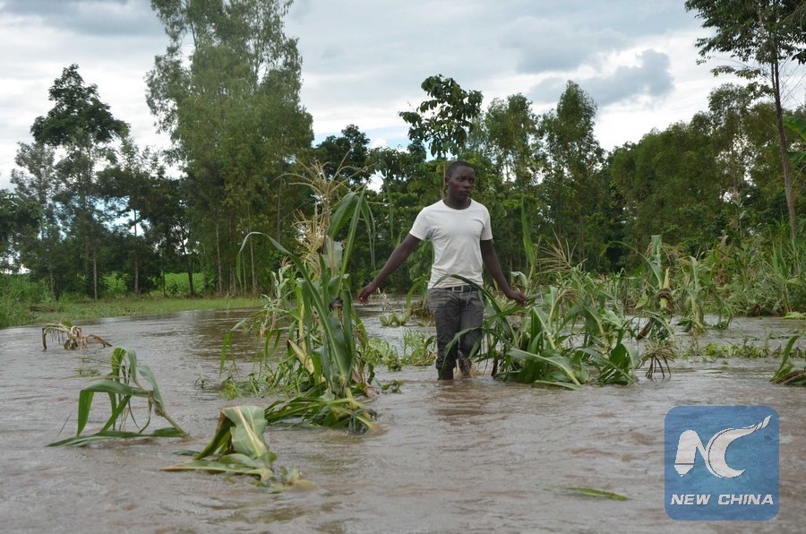 File photo shows a farmer checking the damage caused by floods in his maize garden in Sironko district, eastern Uganda, May 11, 2016. (Xinhua/Daniel Edyegu)
