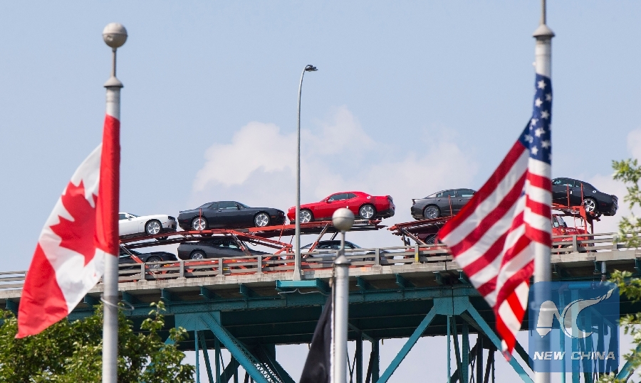 File Photo: An auto transport carrier crosses the Ambassador Bridge heading to the United States in Windsor, Ontario, Canada, on Aug. 16, 2017. (Xinhua/Zou Zheng)