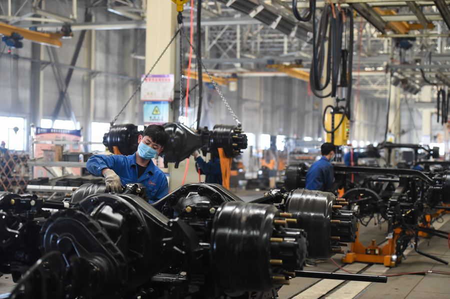 Employees work at a heavy-duty truck assembly line of Shaanxi Automobile Holding Group Co., Ltd. in Xi'an, capital of northwest China's Shaanxi Province, April 23, 2020.The company has resumed its production of heavy-duty trucks at full capacity with epidemic prevention and control efforts.(Xinhua/Zhang Bowen).