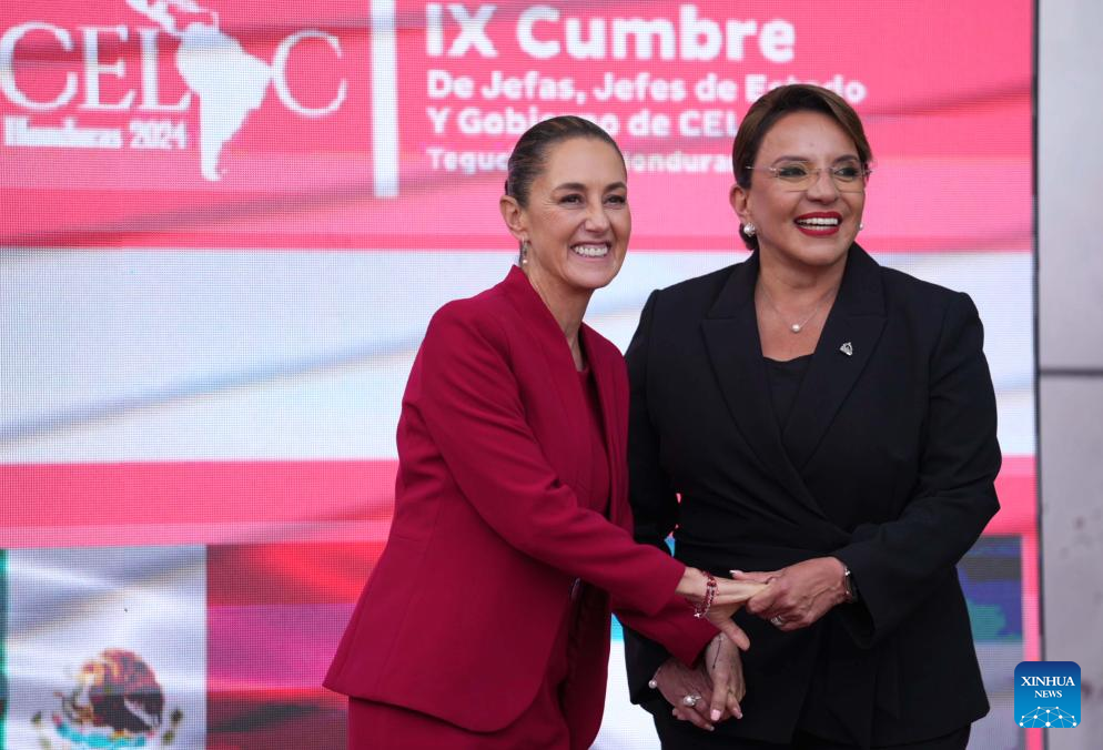 Honduran President Xiomara Castro (R) welcomes Mexican President Claudia Sheinbaum at the latter's arrival to the 9th Summit of Heads of State and Government of the Community of Latin American and Caribbean States (CELAC) in Tegucigalpa, capital of Honduras, April 9, 2025. The summit was attended by over a dozen heads of state and delegations from the bloc's 33 member countries. Honduras formally handed over CELAC's rotating presidency to Colombia. (Photo by David de la Paz/Xinhua)