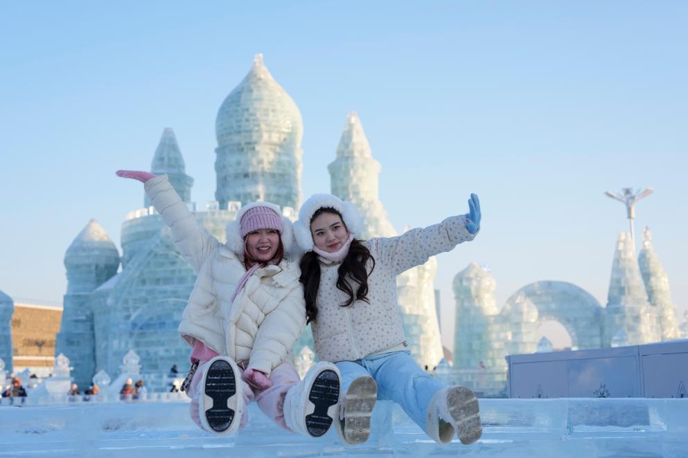 Tourists pose for photos at the Harbin Ice-Snow World in Harbin, northeast China's Heilongjiang Province, Jan. 5, 2026. (Xinhua/Wang Jianwei)