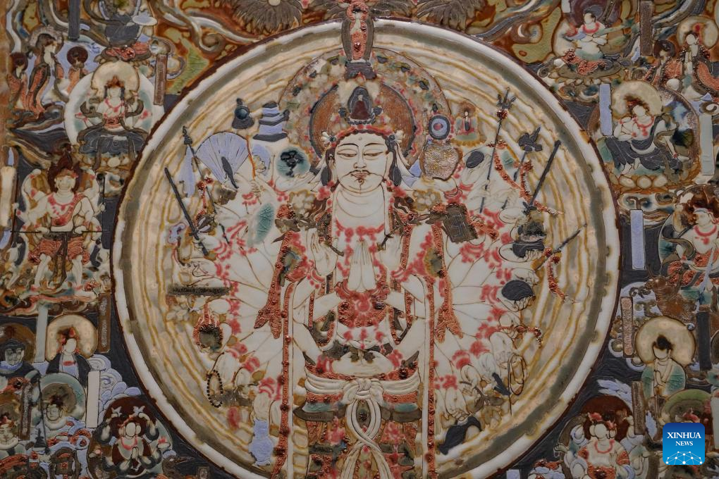 This photo taken on Dec. 19, 2025 shows a ceramic artwork related to Dunhuang murals during the "Dunhuang in Glazes" exhibition at the Jiangxi provincial art museum, in Nanchang, east China's Jiangxi Province. (Xinhua/Zhou Mi)