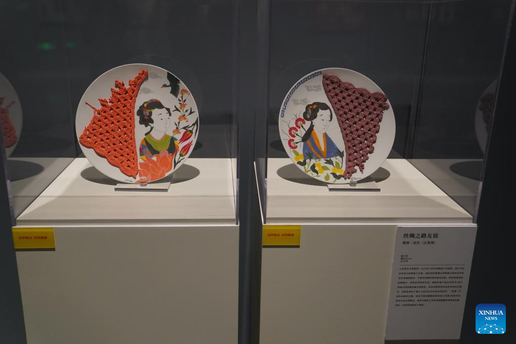 This photo taken on Dec. 19, 2025 shows two ceramic artworks by a Turkish artist during the "Dunhuang in Glazes" exhibition at the Jiangxi provincial art museum, in Nanchang, east China's Jiangxi Province. (Xinhua/Zhou Mi)