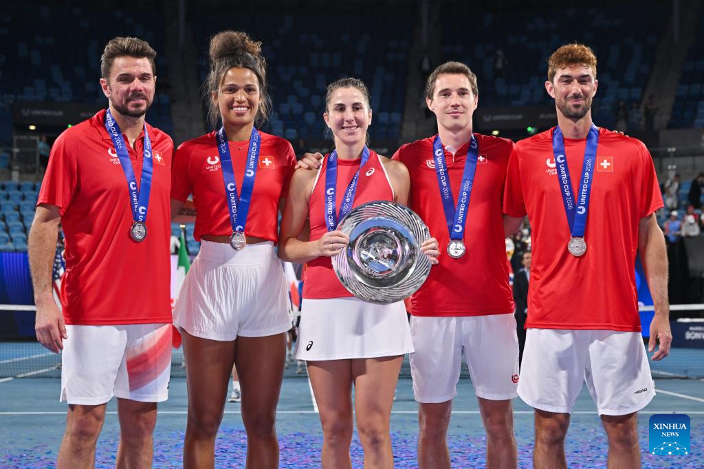 Team Switzerland pose for photo after the final match of the 2026 United Cup tennis tournament in Sydney, Australia, Jan. 11, 2026. (Tennis Australia/Handout via Xinhua)