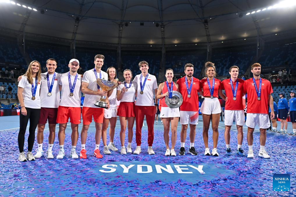 Team Poland (L) and Team Switzerland pose for photo after the final match of the 2026 United Cup tennis tournament in Sydney, Australia, Jan. 11, 2026. (Tennis Australia/Handout via Xinhua)
