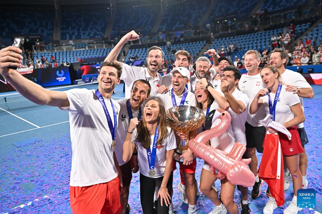 Team Poland celebrate winning the final match against team Switzerland at the 2026 United Cup tennis tournament in Sydney, Australia, Jan. 11, 2026. (Tennis Australia/Handout via Xinhua)
