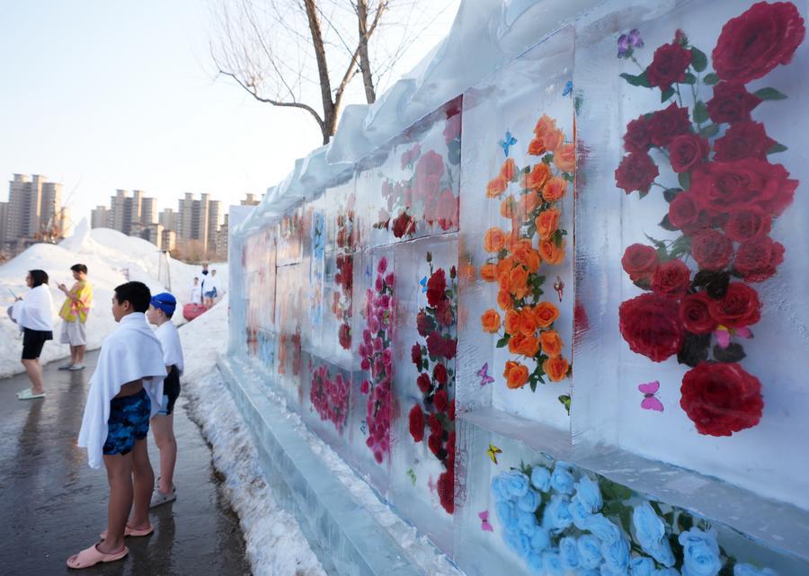 Visitors pose for pictures in front of a wall made of ice bricks with frozen flowers inside at a hot spring resort in Shenyang, northeast China's Liaoning Province, Jan. 17, 2025. (Xinhua/Li Gang)