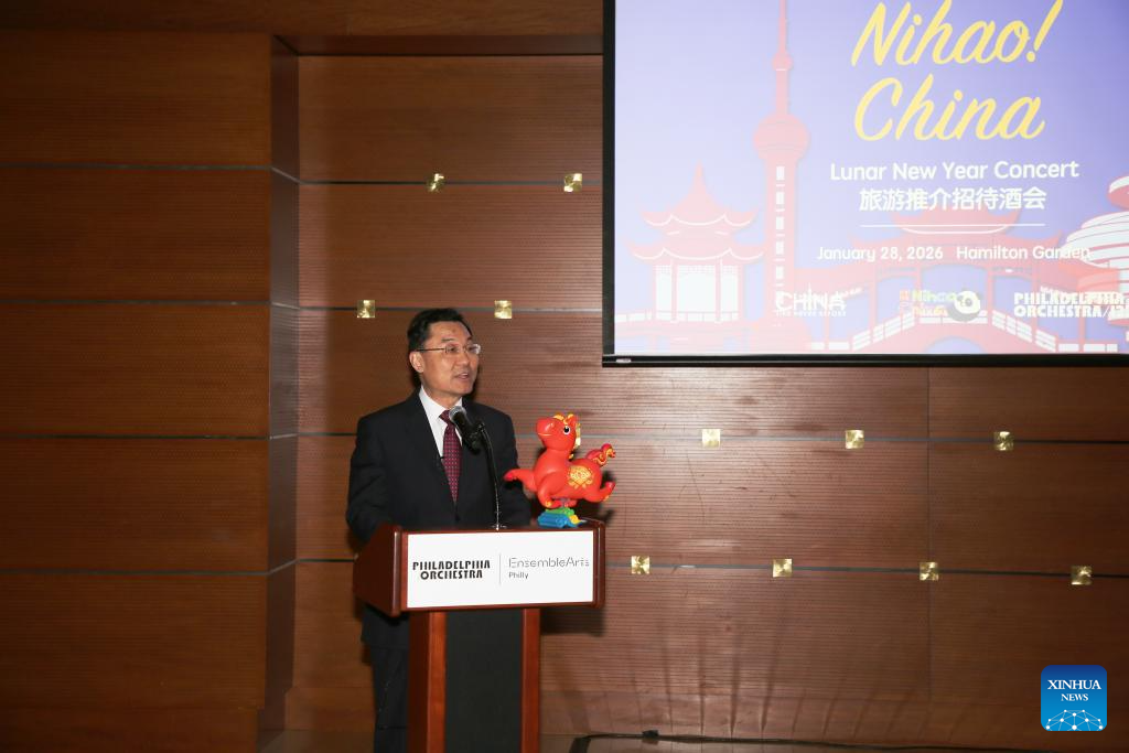 Chinese Ambassador to the United States Xie Feng speaks during the "Ni Hao! China" tourism promotion event at the Kimmel Center for the Performing Arts in Philadelphia, Pennsylvania, the United States, on Jan. 28, 2026. (Xinhua/Zhang Fengguo)