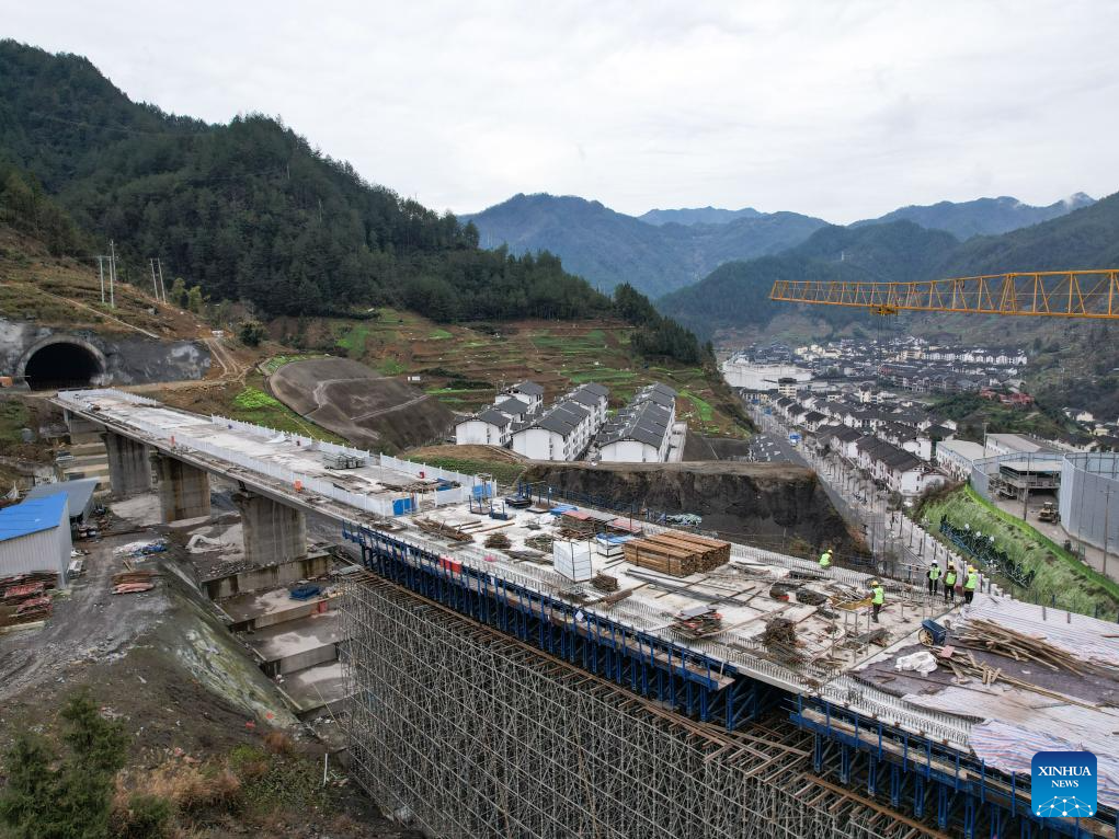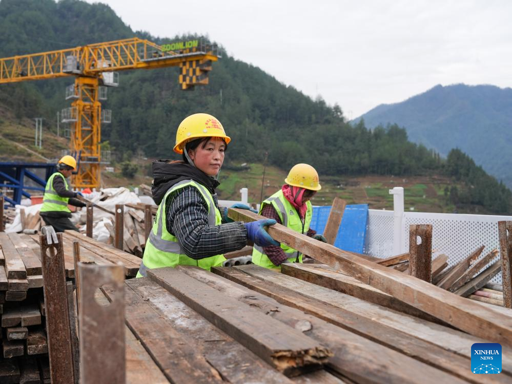 Workers are seen at the construction site of the Dukou Bridge in Xuanhan County of Dazhou, southwest China's Sichuan Province, on Jan. 30, 2026.