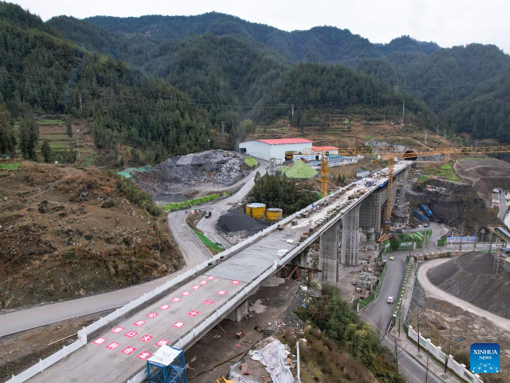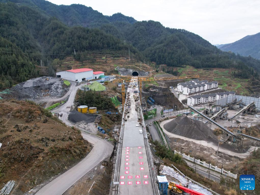 A drone photo taken on Jan. 30, 2026 shows the construction site of Dukou bridge in Xuanhan County of Dazhou, southwest China's Sichuan Province.