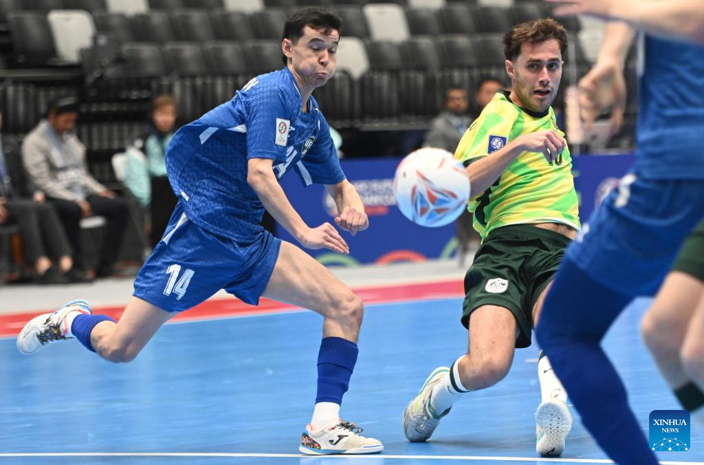Ethan De Melo (R) of Australia vies with Berkinov Samariddin of Uzbekistan during the group C match between Australia and Uzbekistan at the AFC Futsal Asian Cup 2026 in Jakarta, Indonesia, Jan. 30, 2026. (Xinhua/Zulkarnain)