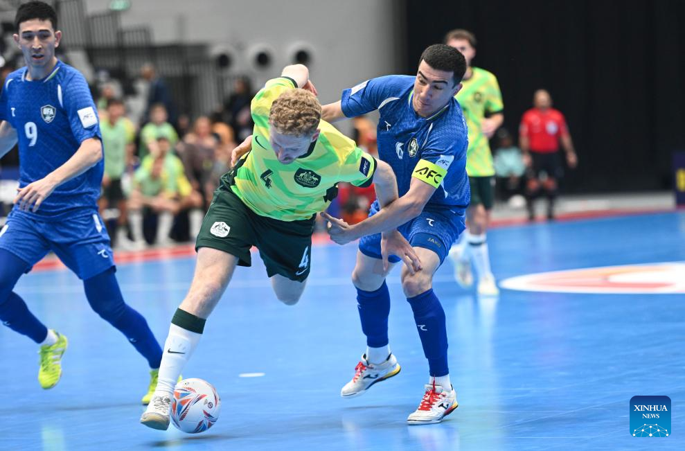 Dominic Cox (C) of Australia vies with Ilkhomjon Khamroev of Uzbekistan during the group C match between Australia and Uzbekistan at the AFC Futsal Asian Cup 2026 in Jakarta, Indonesia, Jan. 30, 2026. (Xinhua/Zulkarnain)