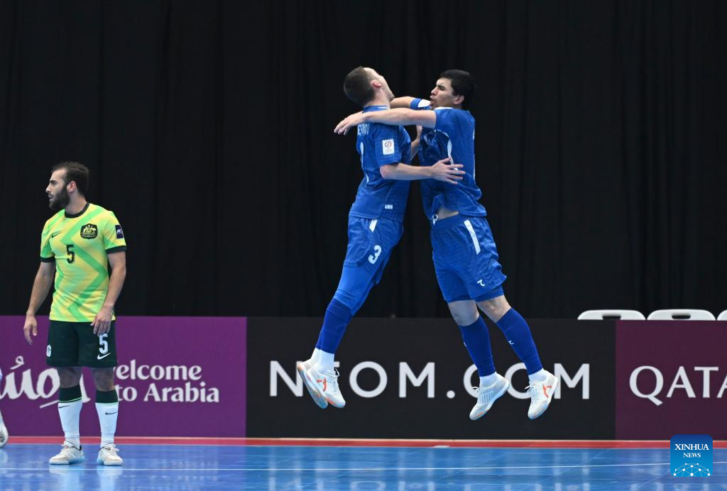 Ropiev Ikhtiyor (R) of Uzbekistan celebrates a goal with his teammate during the group C match between Australia and Uzbekistan at the AFC Futsal Asian Cup 2026 in Jakarta, Indonesia, Jan. 30, 2026. (Xinhua/Zulkarnain)