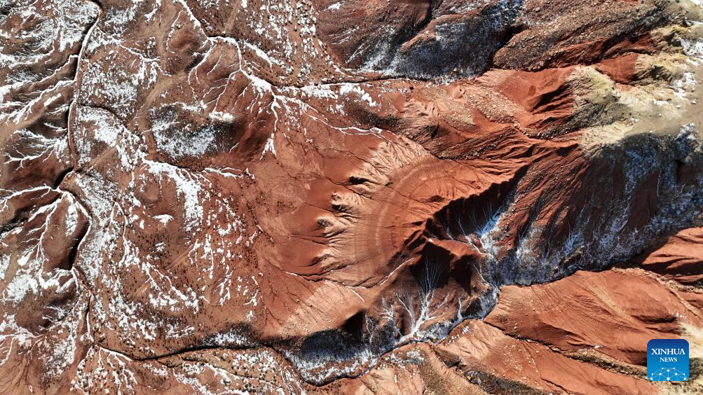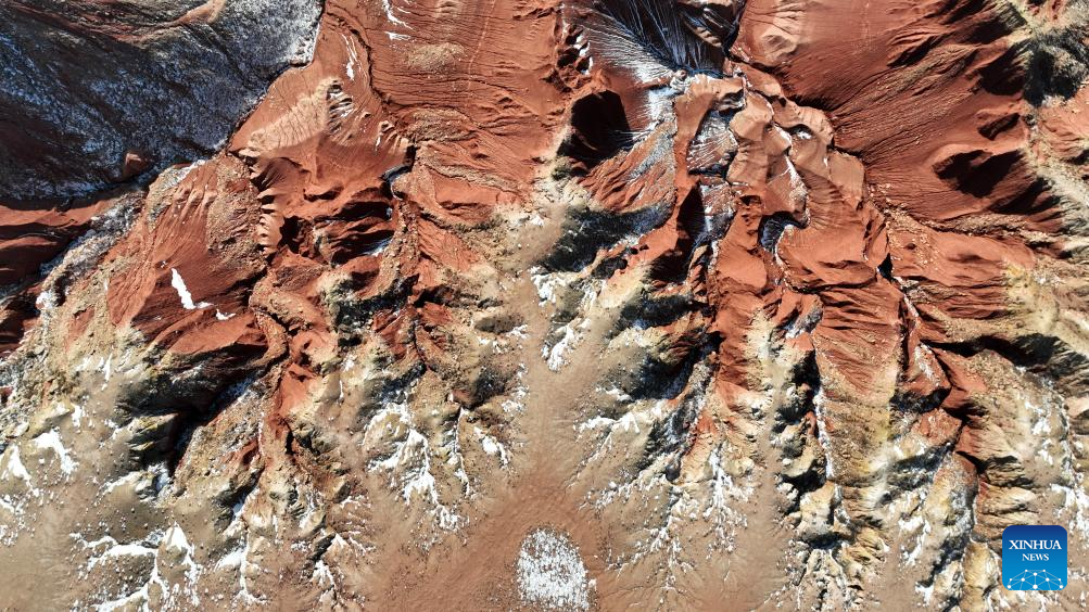 An aerial drone photo taken on Jan. 29, 2026 shows a scene of the Hongya Tableland in Siziwang Banner, north China's Inner Mongolia Autonomous Region. Located in the northern part of Siziwang Banner in Ulanqab, the Hongya Tableland is a key component of the Siziwang National Geopark in north China's Inner Mongolia Autonomous Region. Featuring towering red hills and deep gullies, the landscape forms a majestic painting with lingering snow. (Xinhua/Ma Jinrui)