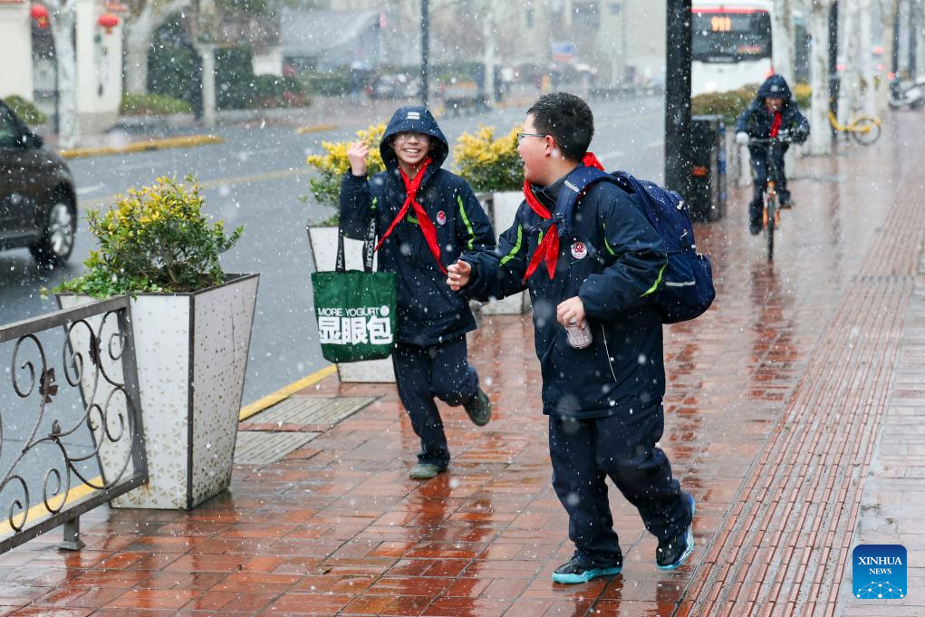 Children have fun amid snow in Xuhui District of Shanghai, east China, Jan. 20, 2026. Regarding widespread snowfall and temperature drops in various regions across China, measures have been taken to actively respond to these weather conditions. (Xinhua/Wang Xiang)