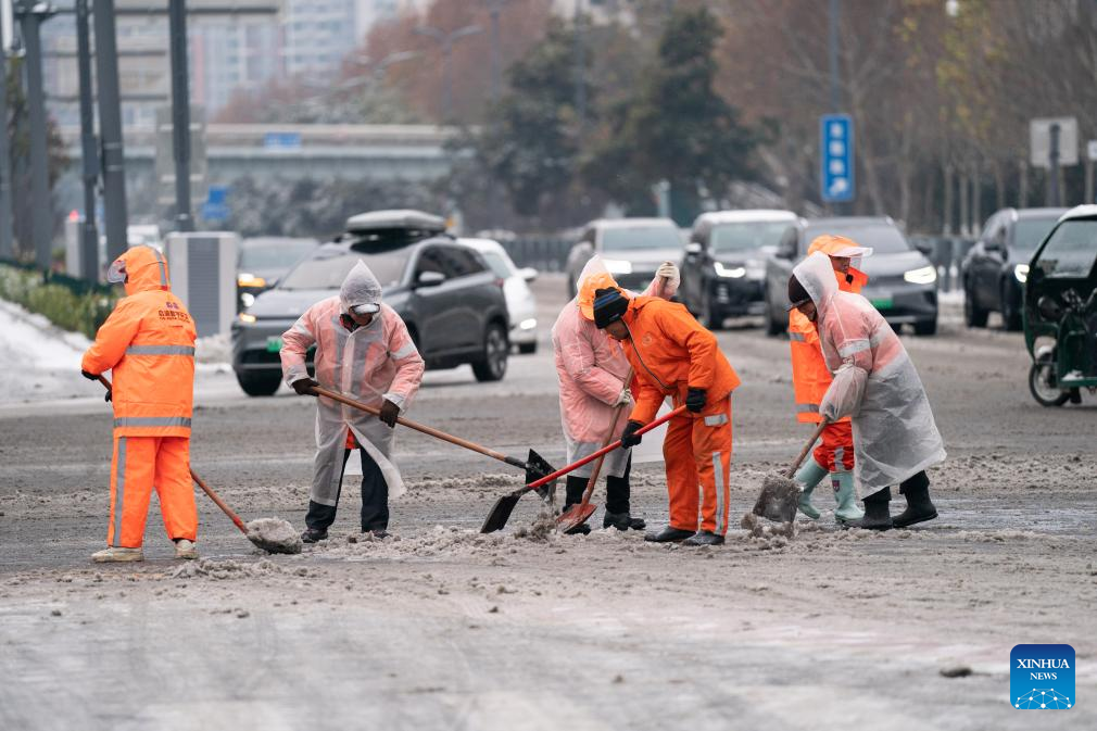 People clear snow on a road in Nanjing, east China's Jiangsu Province, Jan. 20, 2026. Regarding widespread snowfall and temperature drops in various regions across China, measures have been taken to actively respond to these weather conditions. (Photo by Liu Zhenrui/Xinhua)