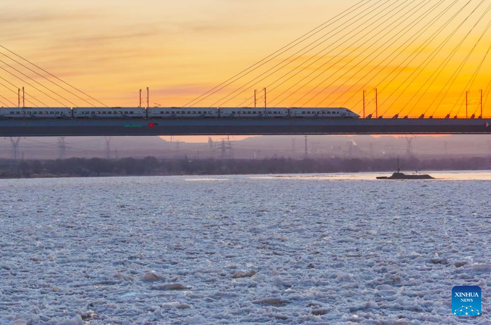 An aerial drone photo taken on Jan. 21, 2026 shows the frozen surface of the Yellow River along the border of Shizuishan City of northwest China's Ningxia Hui Autonomous Region and Wuhai City of north China's Inner Mongolia Autonomous Region amid a cold wave. (Photo by Yuan Hongyan/Xinhua)