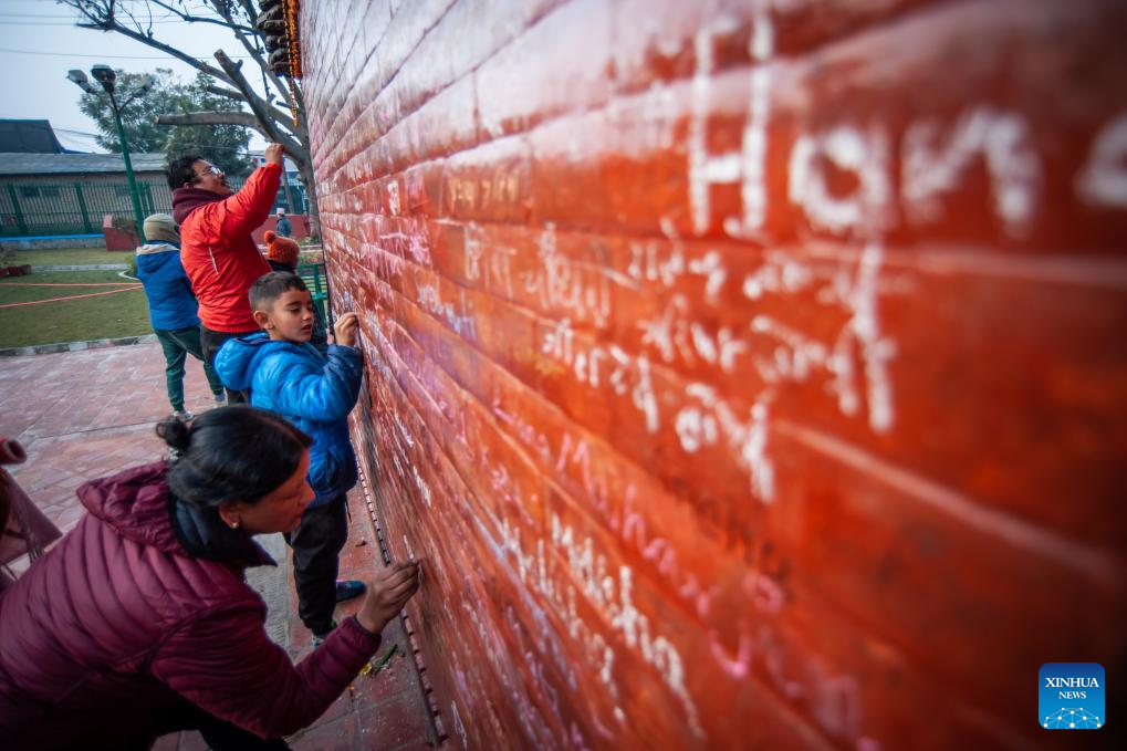 People write their names on the wall of the temple of Goddess of Knowledge Saraswati in celebration of Basanta Panchami or Shree Panchami festival in Lalitpur, Nepal, Jan. 23, 2026. The festival is observed by worshipping Saraswati, the Hindu goddess of knowledge, wisdom, learning, art, music and culture. (Photo by Hari Maharjan/Xinhua)