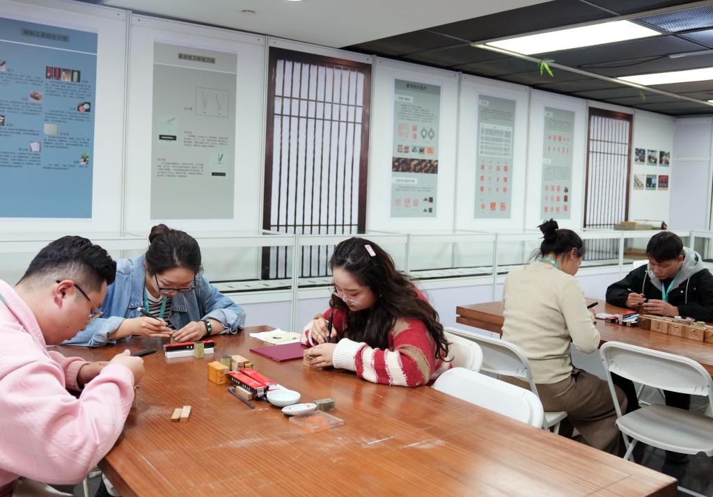 12月19日,在篆刻工作坊,参展学生进行篆刻展示。