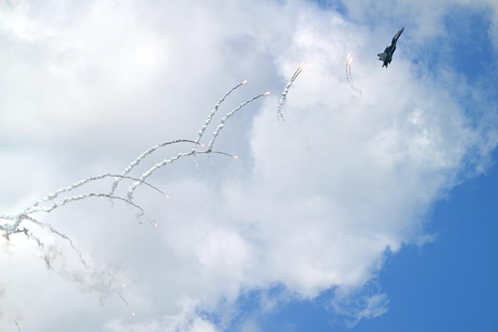 2月3日,一架马来西亚皇家空军SU-30MKM战斗机在第十届新加坡航展首日进行飞行表演。