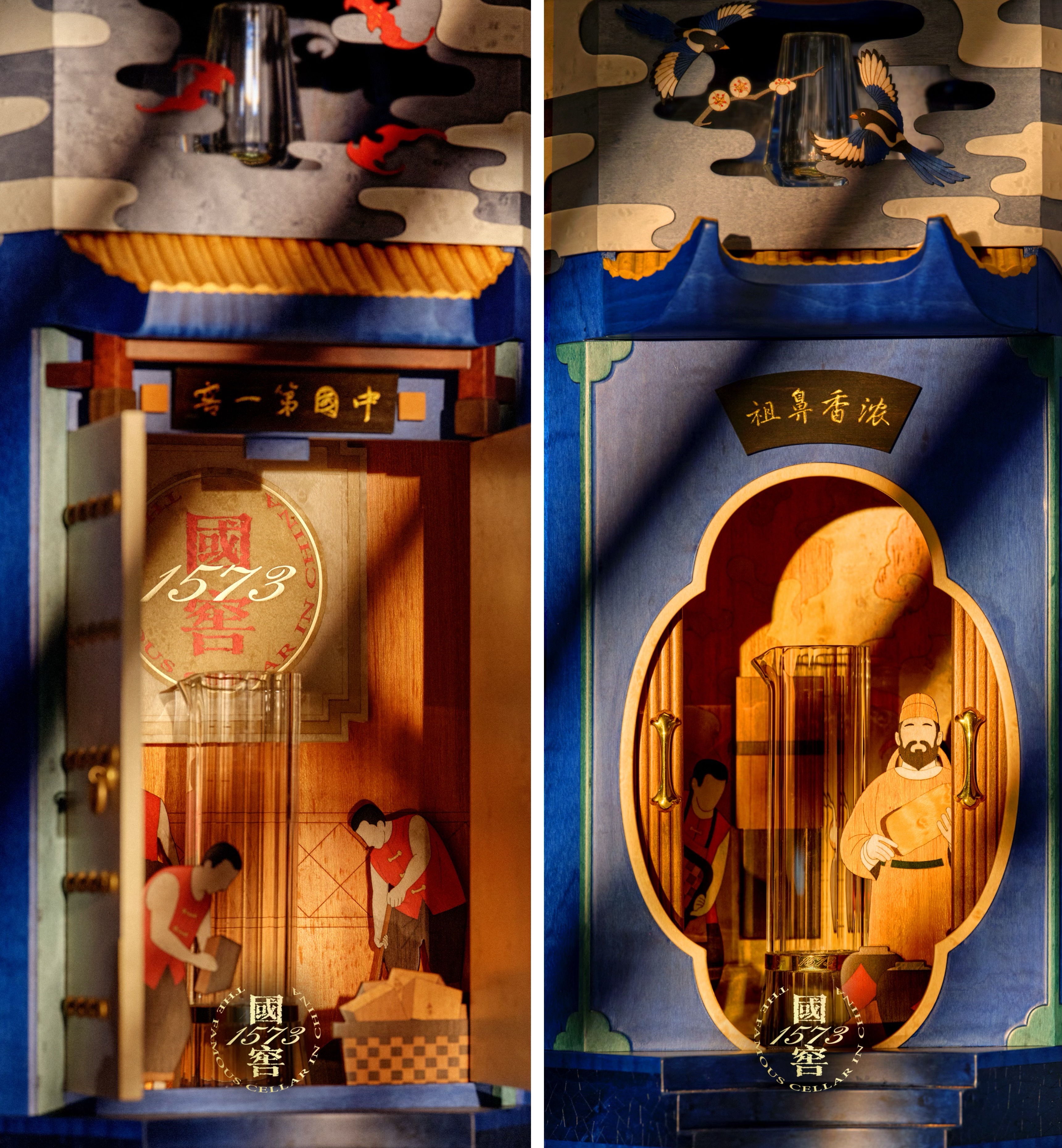 格间天地,一步一景。细木镶嵌技艺以紫檀、黄花梨、酸枝等珍贵木料为颜料,通过削、切、挤、嵌的繁复工序,在毫厘之间拼贴出南北双庭院的微观宇宙。左侧北方庭院,以深褐色木纹勾勒传统四合院的屋檐翘角,窗棂格纹精密如绣,院内微缩复刻"1573国宝窖池群"的酿酒盛景,453年活态窖池的厚重历史,凝于一方木格之中;右侧南方庭院,则以浅色调木料镶嵌出烟雨江南的飞檐黛瓦,庭院中央矗立着首创甘醇曲的元代酿酒大师郭怀玉的立体浮雕,致敬浓香鼻祖的技艺源流。南北庭院以中轴线对称,国窖1573居于正中,仿佛悬浮于青山绿水之间,恰是"天地同酿,人间共生"的视觉化表达。