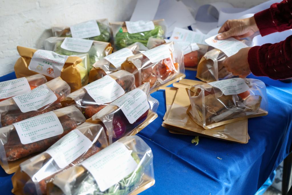 ↑一家生鲜超市外,一批蔬菜被分装好准备送往“食物银行”智能柜机(12月19日摄)。