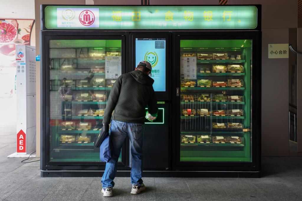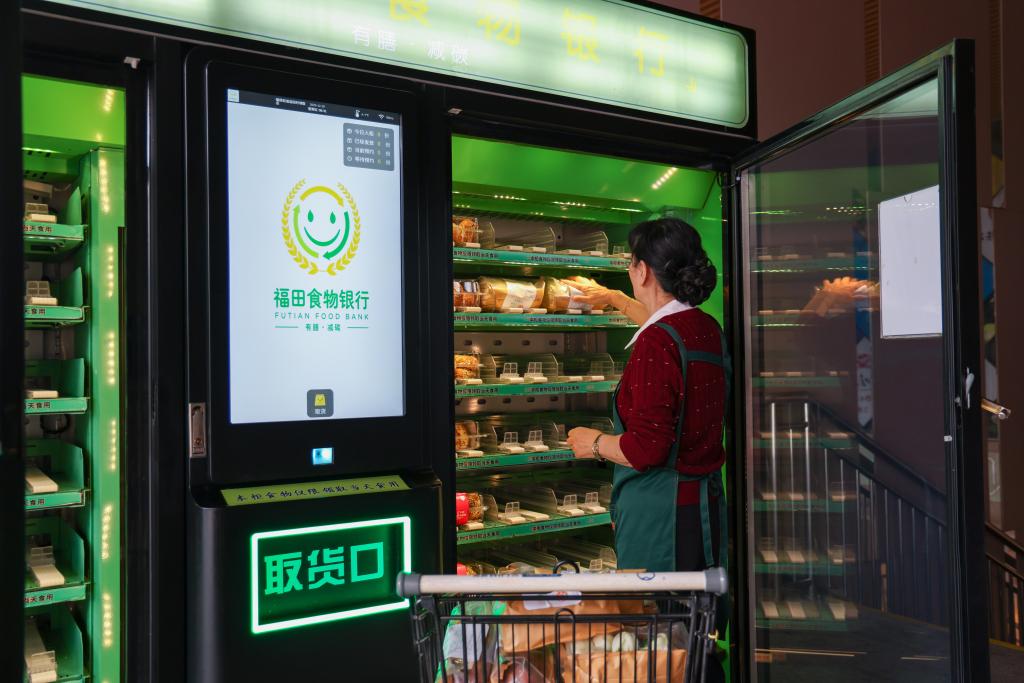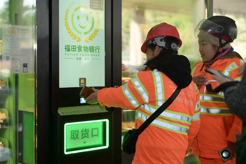 ↑在福田区益田村“食物银行”智能柜机前,居民前来领取食品(12月19日摄)。