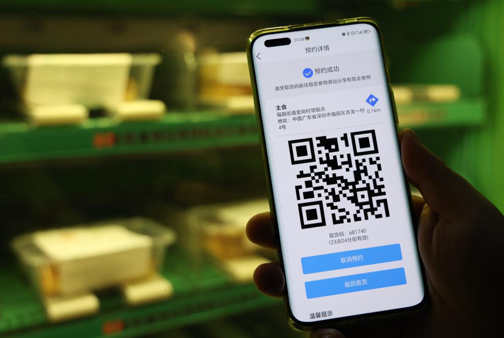 ↑晚上8时后,剩余食物开放给全体居民,一位居民在“i深圳”app上预约成功,前来领取食物(12月20日摄)。