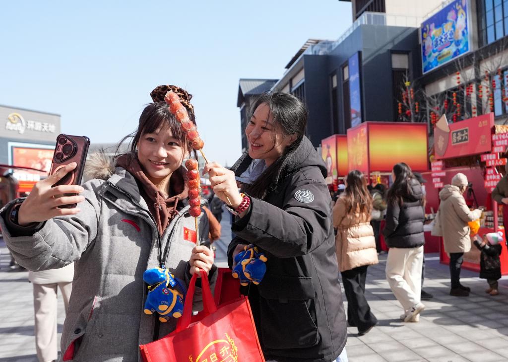 2月12日,在北京市东城区2026隆福寺新春市集,两位游客拿着刚刚购买的冰糖葫芦自拍留念。