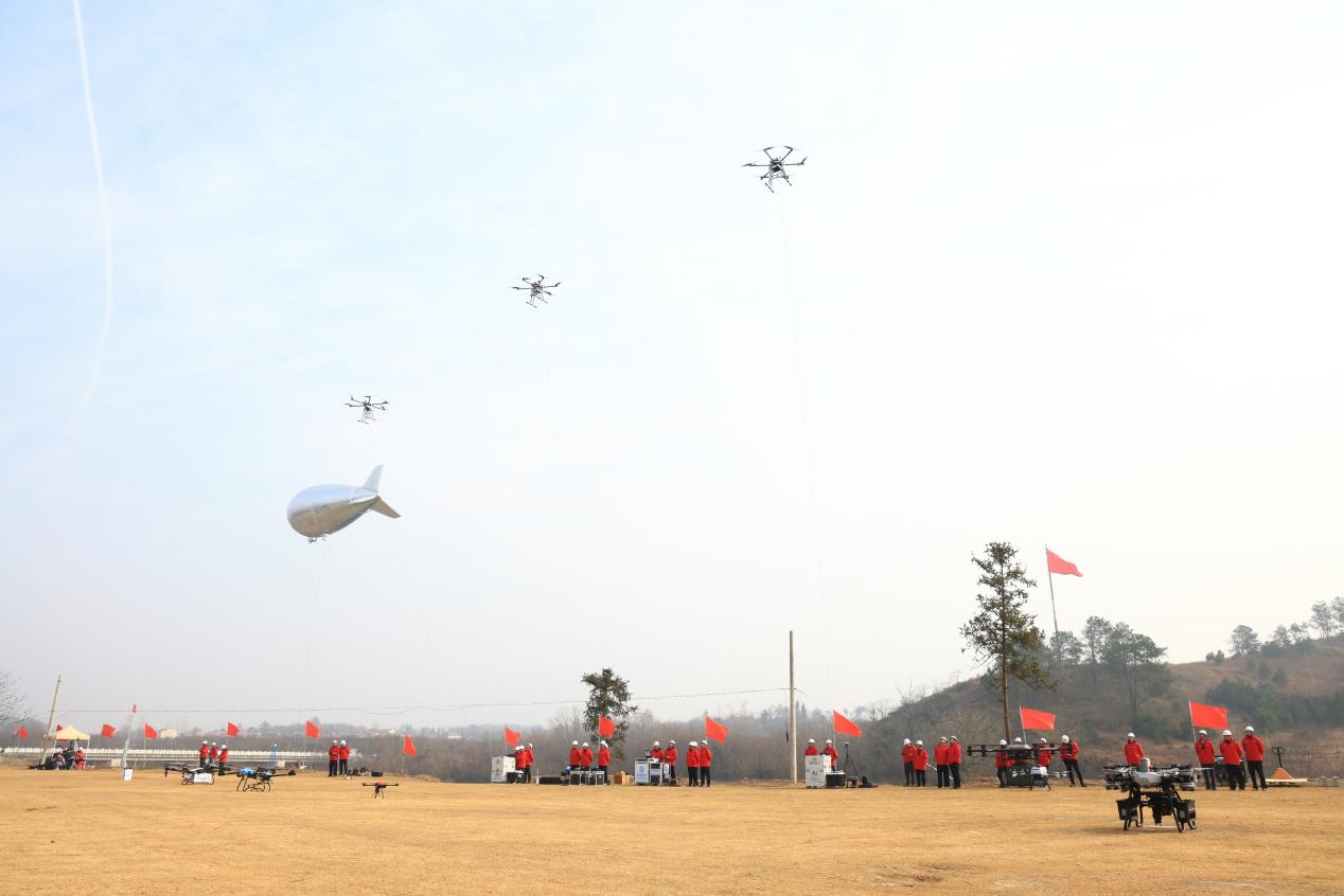 ——“三断”场景通信托底保障:山区模拟极端“三断”场景,各科目协同破局。应急通信保障队员搭乘直升机、全地形车,携带智能单兵、机械外骨骼及智能卫星通信机器狗等装备,为救援队伍构建随行通信保障体系;中电信应急公司的“急翎投”无人机编队成为核心战力——运输无人机搭载全自动卫星便携基站,在中继无人机的超视距通信支撑下跨山飞行10公里,悬停后通过索降装置精准投放,基站落地即自动展开、对星、入网,仅5分钟便恢复区域4G网络,同步投送的一键通联卫星电话也迅速送达“失联村庄”群众手中。这套“一高一快”空中方案中,系留式高空飞艇与无人直升机全天候作业,配合全网通卫星基站接入国家应急通信融合接入平台,实现公众通信网络信号无盲区覆盖。“这套系统首创‘运输+通信’双能力融合,能载重50公斤跨山投送设备,实现‘装备投到哪、网络铺到哪’,是山区‘三断’场景的‘破局利器’”,队员擦着冻红的脸颊介绍。