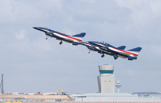 “cleared for takeoff(允许起飞)”,接到塔台起飞指令后,6架歼-10表演机在云底高600米的条件下,分2批快速滑跑起飞,伴随着巨大轰鸣声冲向天际,在空中完成集合编组后,随即飞往机场附近海面上空。