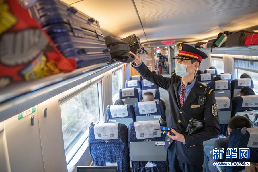 2月9日,在重慶北開往萬州北的C6422次列車上,付寶印在巡視車廂時(shí)為旅客調(diào)整行李架上的行李。新華社記者 黃偉 攝