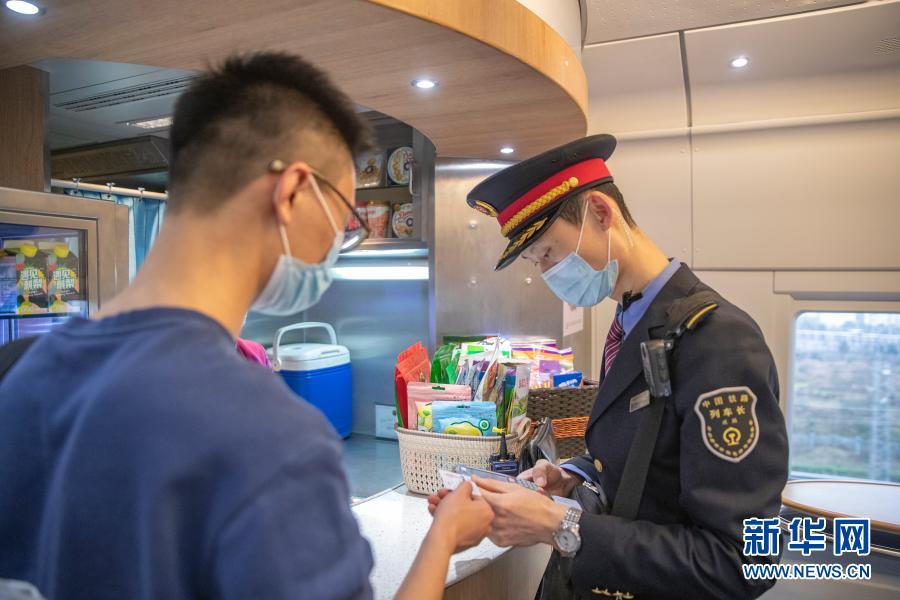 2月9日,在重慶北開往萬(wàn)州北的C6422次列車上,付寶印為一名旅客辦理補(bǔ)票業(yè)務(wù)。新華社記者 黃偉 攝