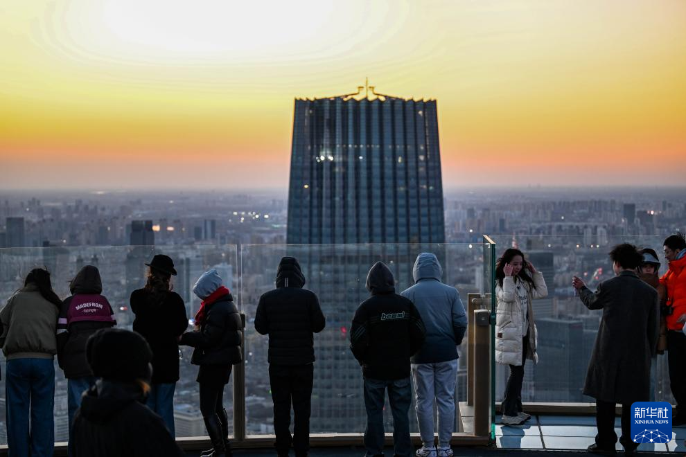 游人在津湾云顶高空观景台欣赏落日(12月20日摄)。