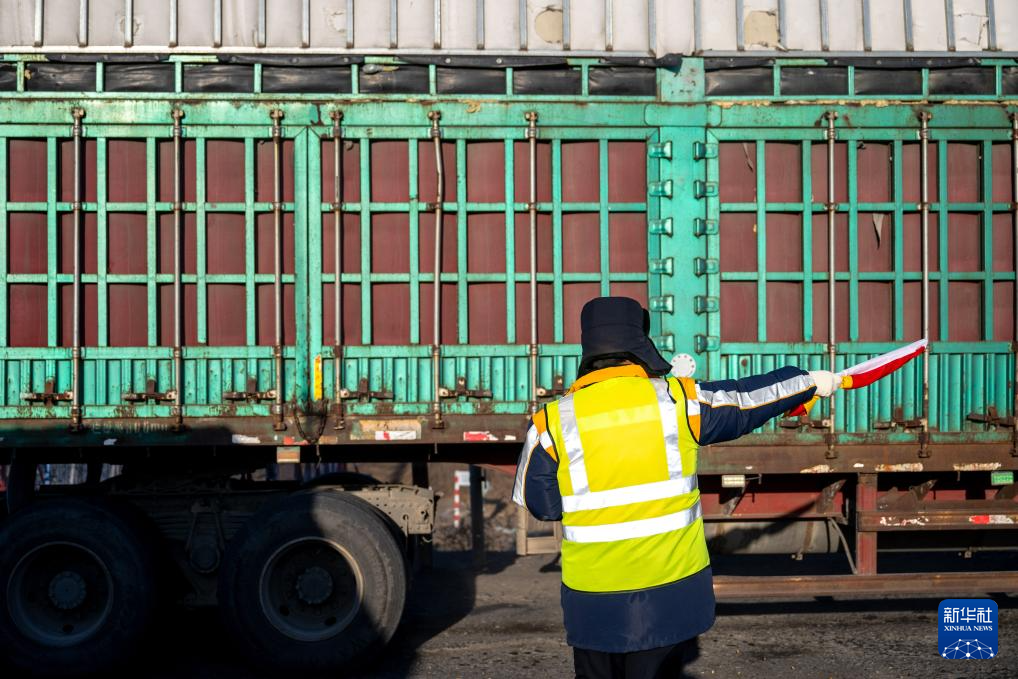 2月1日,工人张浩在道口指挥过往车辆通行。